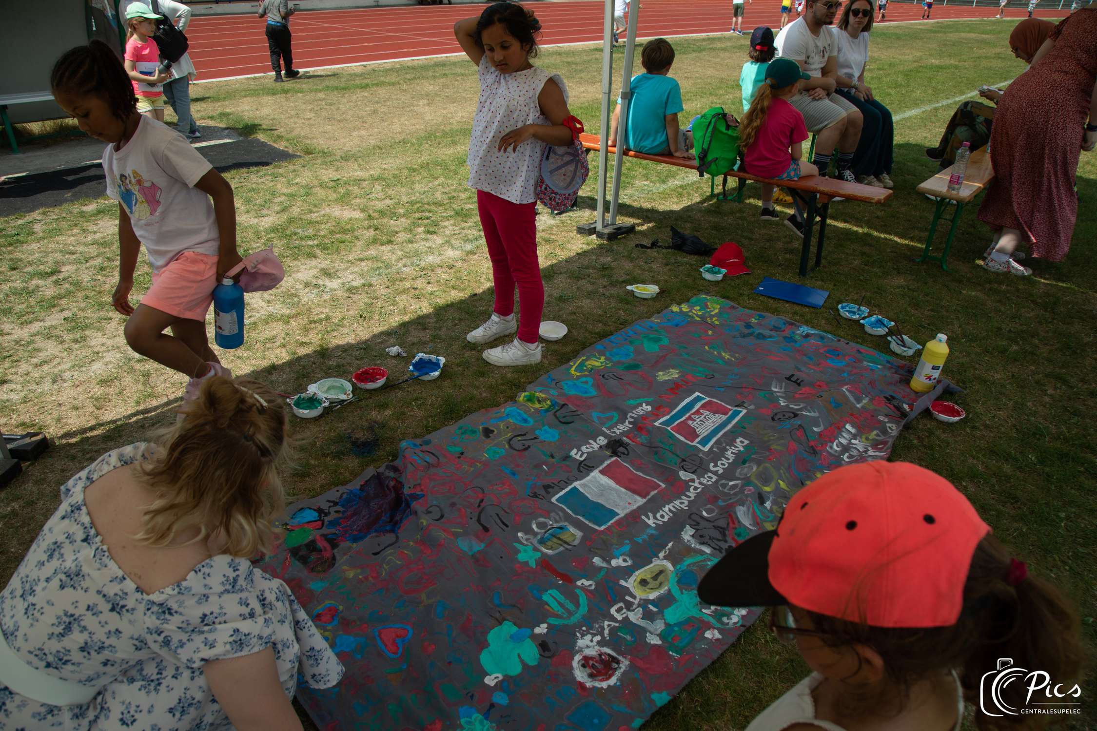 Le jour J : les enfants courent et profitent des différentes activités que nous leur proposons : stand photo avec des accessoires cambodgiens, peinture, parcours du combattant, fanfare...).